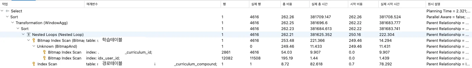 즉 학습테이블에서 수천건이 나왔을때 각 건마다 경로테이블 인덱스 스캔 → curriculum_id가 맞는지 필터로 하나하나 확인 → 필터로 버려지는 레코드가 많아질수록 불필요한 레코드를 반복적으로 읽게되서 디스크 I/O와 CPU 소모가 쌓여 시간 폭증
