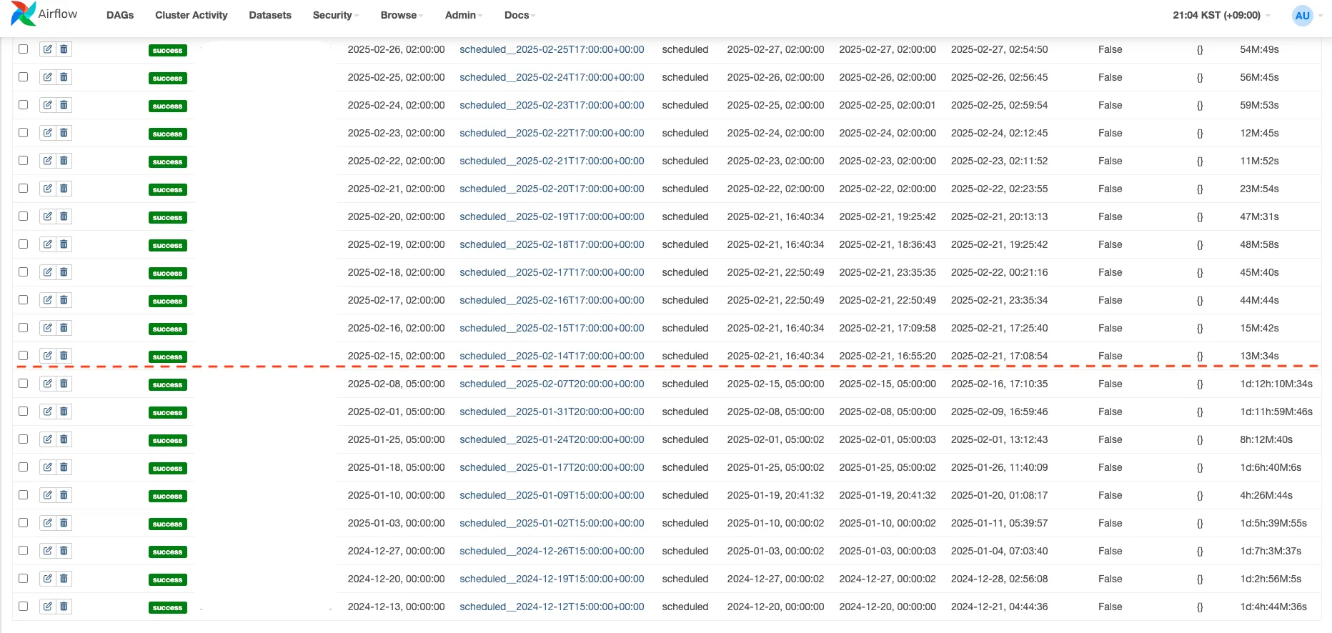 빨간 줄 전후로 줄어든 에어플로우 실행 시간