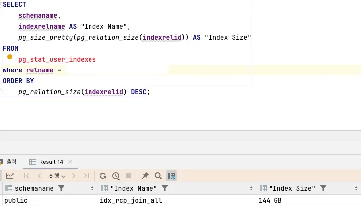 하지만 이 새로운 인덱스는 크기가 매우커 PostgreSQL 플래너가 이를 활용하지 않고 기존의 인덱스를 계속 사용했다. 실제 크기를 조회해보니 테이블 크기가 385GB인데 4컬럼 복합 인덱스의 크기가 144GB로 인덱스가 테이블 크기의 1/3 차지했다.