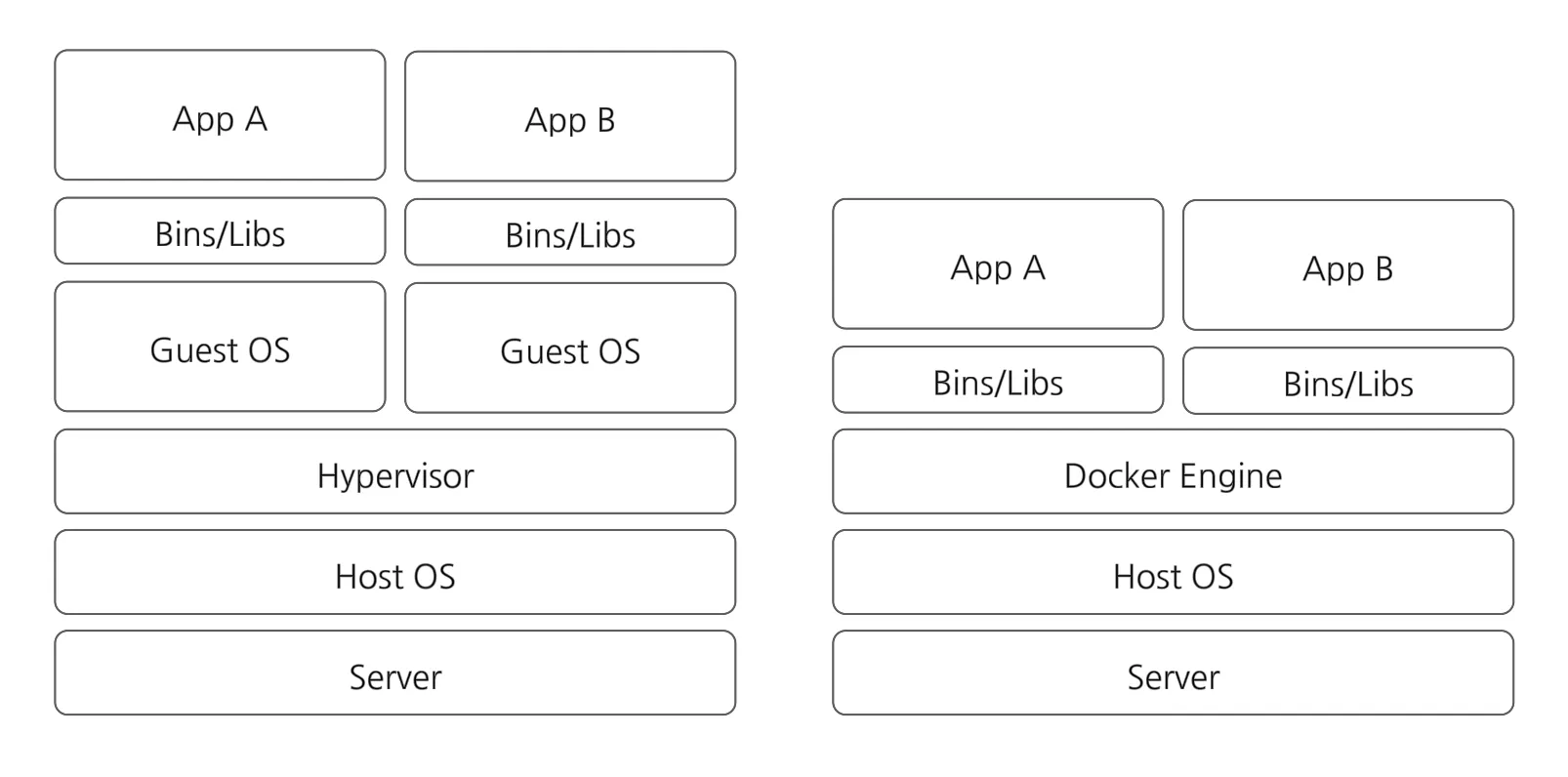 가상화 대상 | 애플리케이션과 실행 환경 | 전체 운영 체제(OS + 앱) |