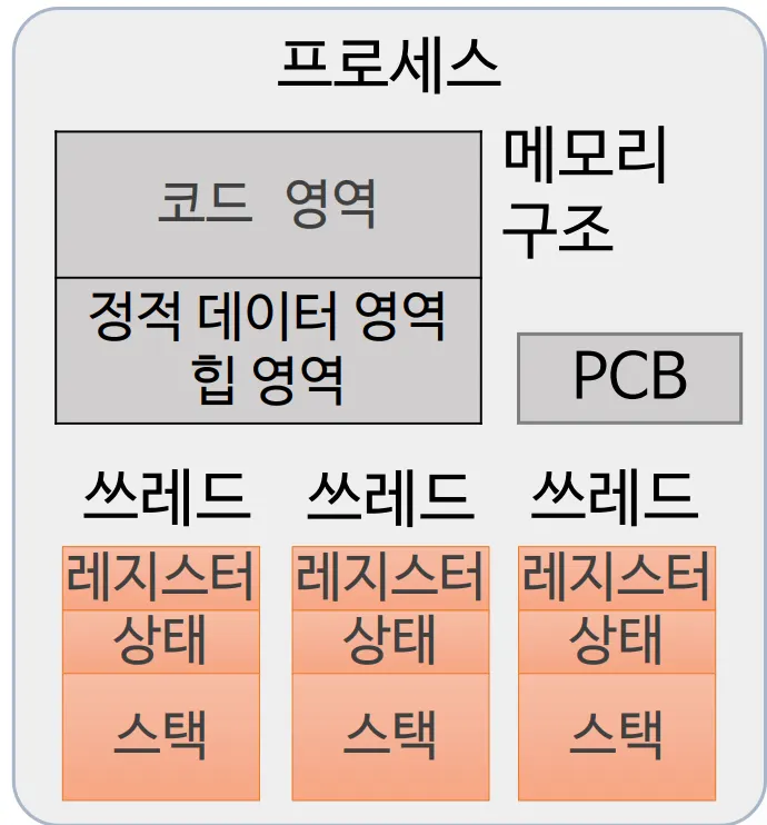 스레드는 독립적인 스택과 레지스터를 가지지만, 코드/데이터/힙은 같은 프로세스 내에서 공유