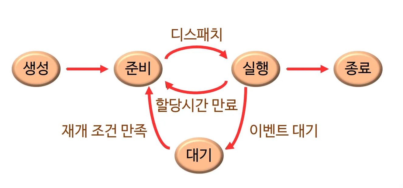 대기 → 준비: 요청한 작업(예: 입출력)이 완료되면 다시 실행 준비 상태로 이동