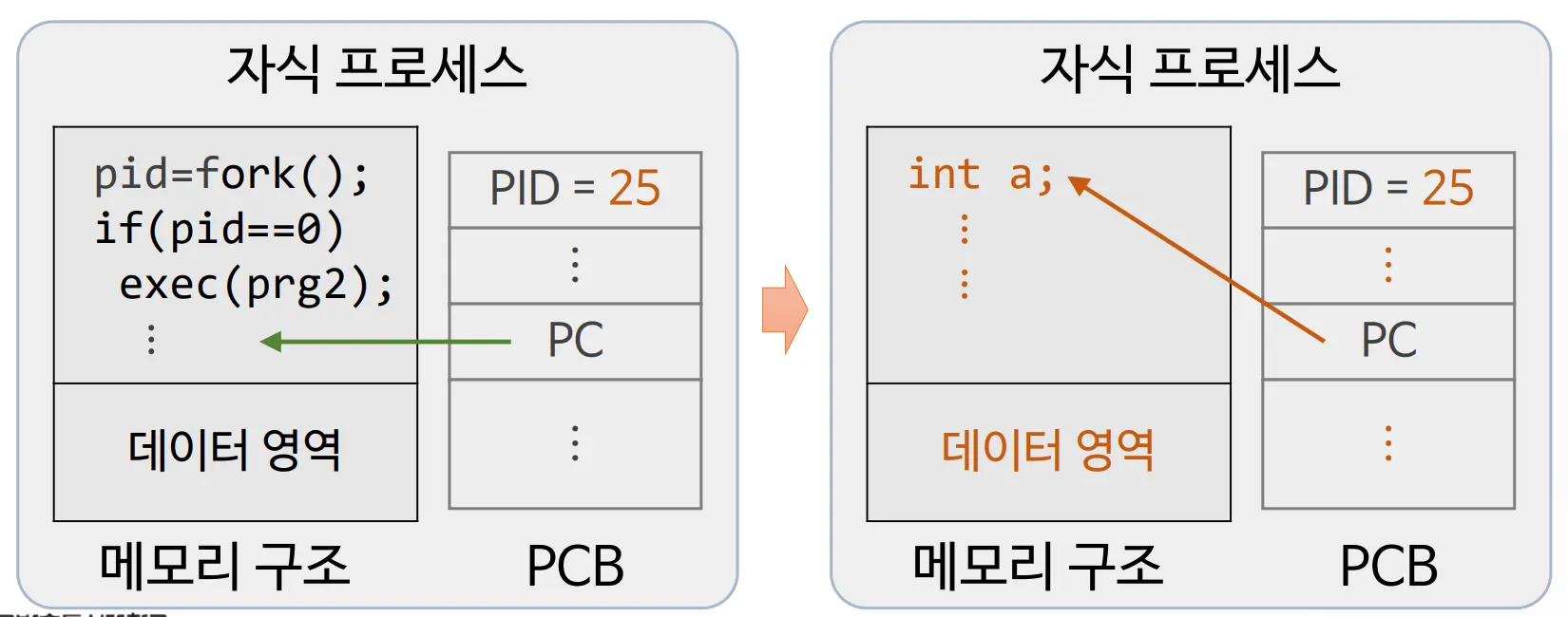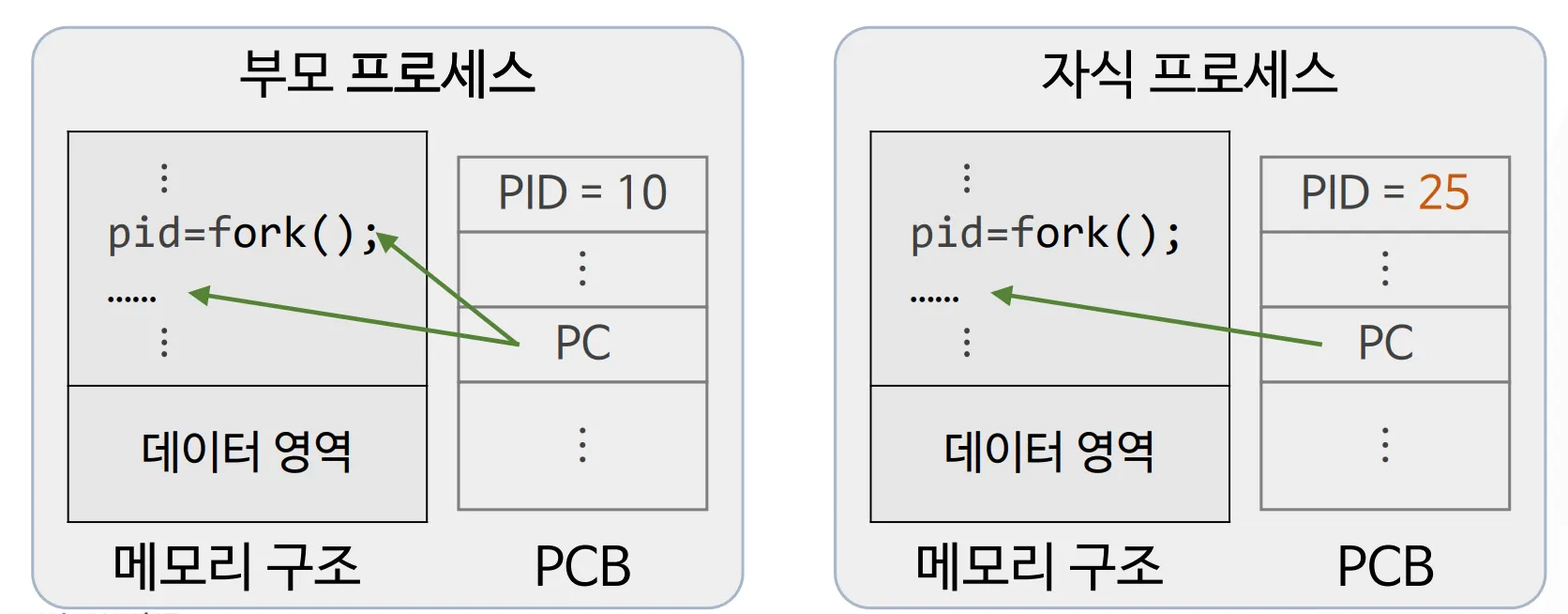 fork() : 자식 프로세스는 부모 프로세스의 메모리 공간 그대로 복사 (PID 변경)