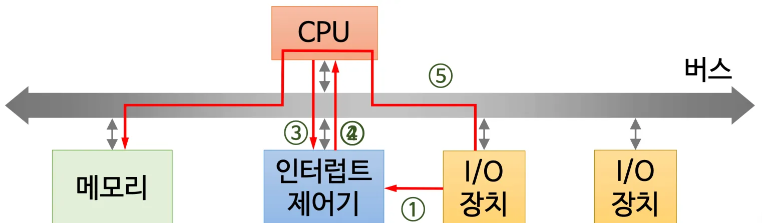 인터럽트: 어떤 장치가 다른 장치의 작업을 잠시 중단시키고 자신의 상태를 알리는 기능
