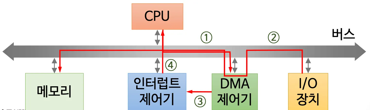 DMA 제어기가 장치에 전송 명령 → 메모리와 직접 데이터 교환