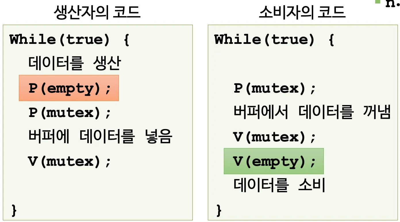 버퍼가 가득찬 경우 동기화: 세마포어 empty(초깃값 n)
