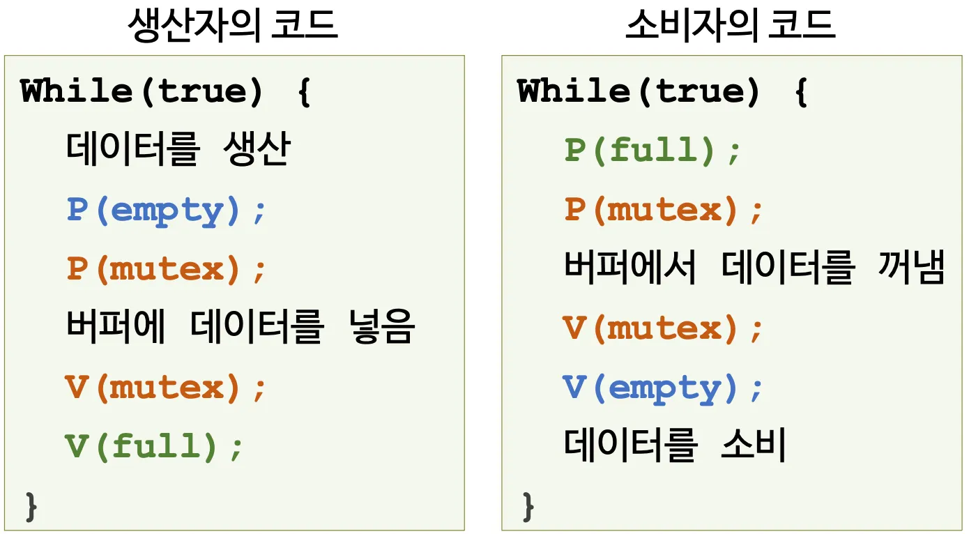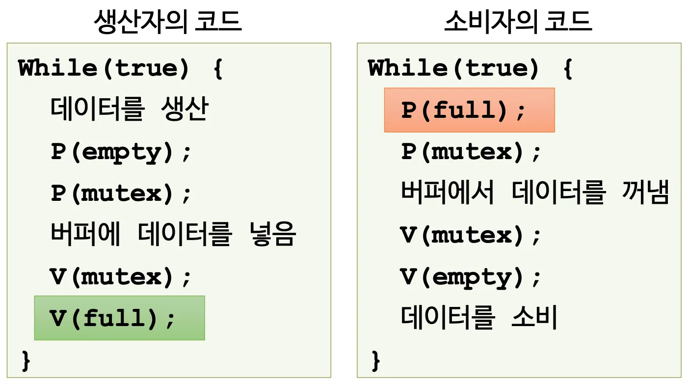 버퍼가 빈 경우 동기화: 세마포어 full(초깃값 0)