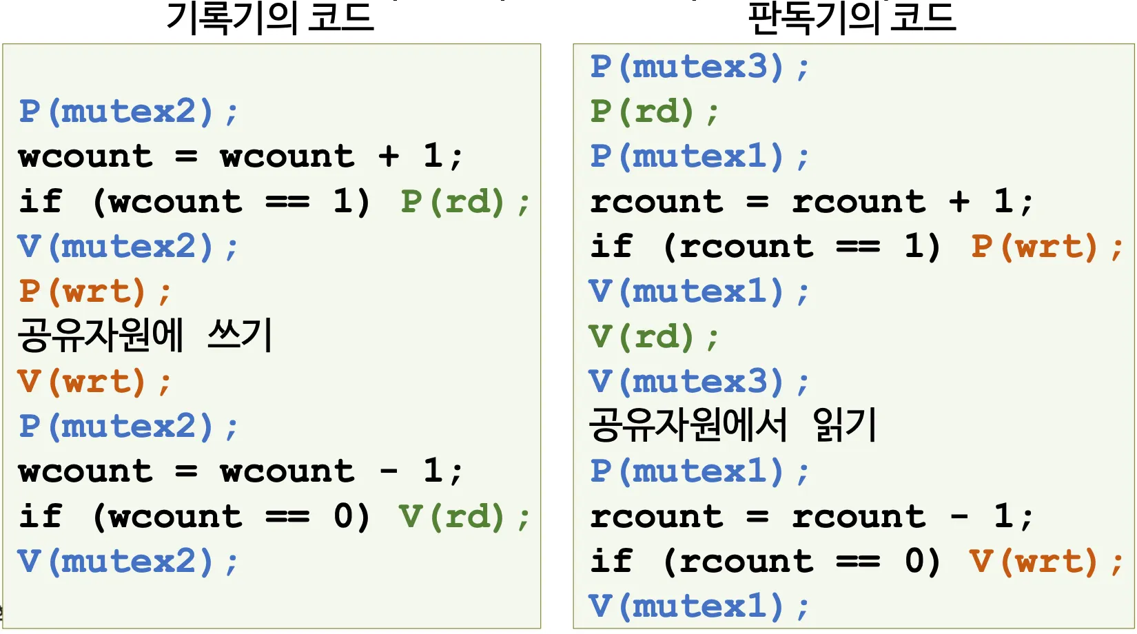 조금 복잡하지만 > 판독기가 기록기가 우선순위 가짐, 기록기 접근 중이면 판독기 추가 진입 불가능하게 제한