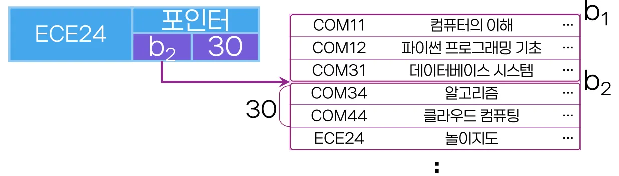 포인터: 실제 레코드가 저장된 위치를 가리킴