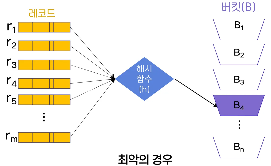 해시 함수가 비효율적이거나 데이터가 쏠릴 경우, 하나의 버킷에 몰려 충돌이 발생하는 최악의 케이스