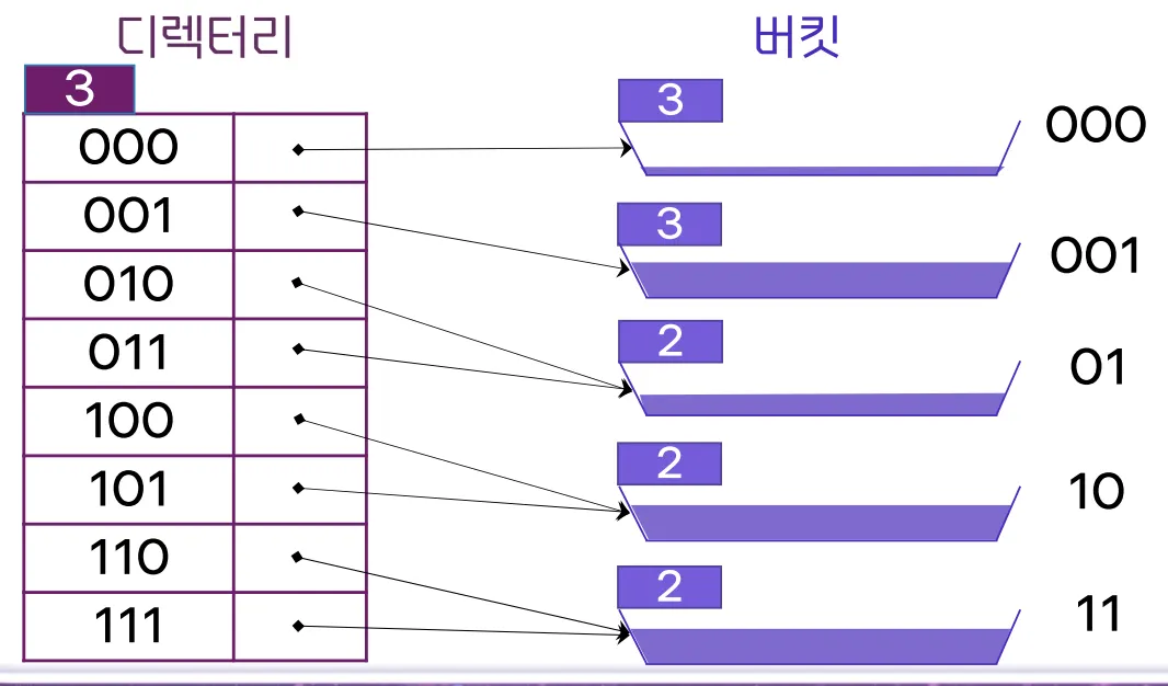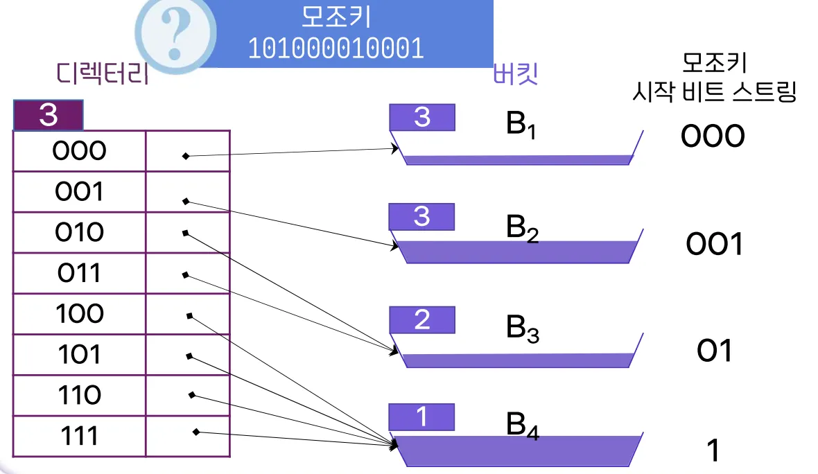 디렉터리는 개의 포인터를 가지며 각 포인터는 버킷을 가리킴