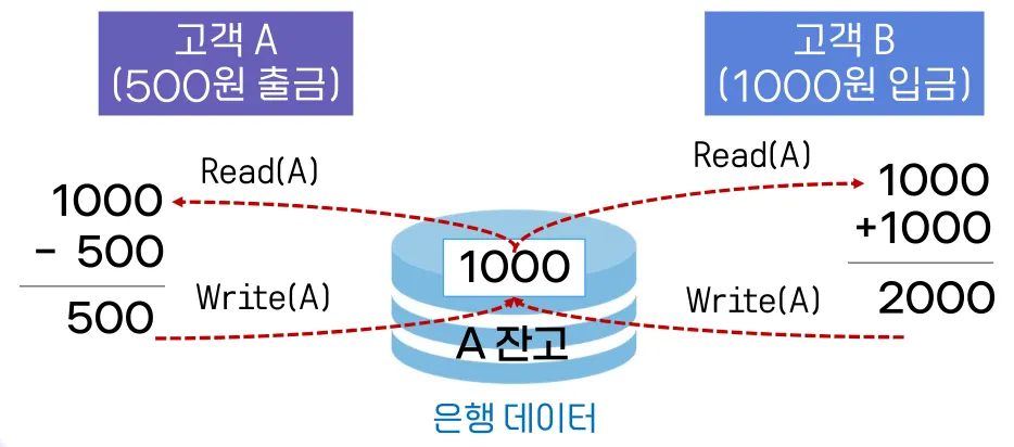 다중 사용자 환경에서 트랜잭션 동시 실행으로 데이터 갱신시, 일관성 훼손 문제 발생