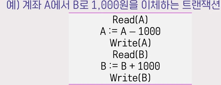 Write(X): 트랜잭션이 실행되는 메모리에 있는 변수 X의 값을 데이터베이스에 저장하는 연산