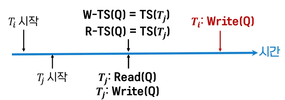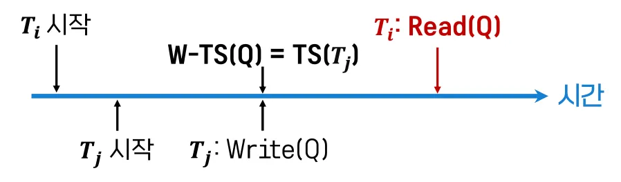 Ti보다 나중에 Write(Q)가 이미 발생함 → 이미 미래 데이터가 기록된 상태