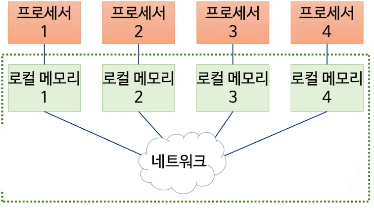각 프로세서가 자기만의 로컬 메모리를 갖는 분산 공유 메모리