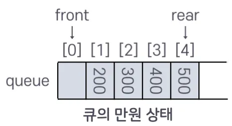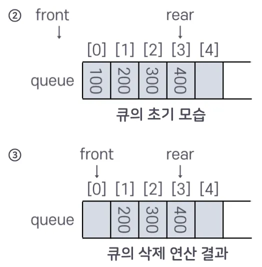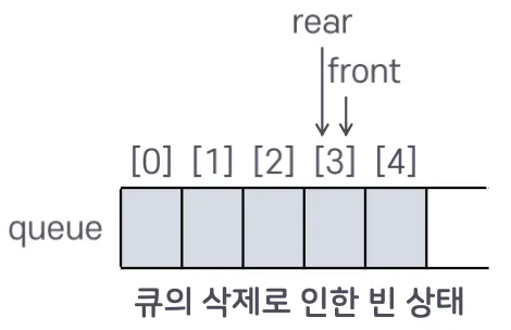 front는 삭제 직전 원소를 가리키는 위치로 실제 첫 번째 원소보다 하나 앞 인덱스를 유지