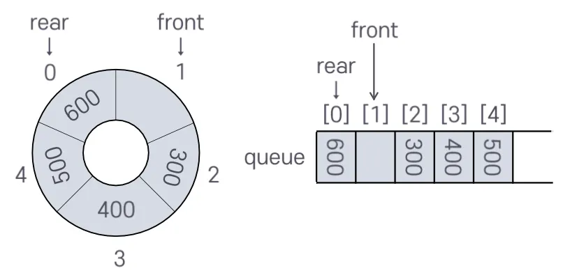 rear가 배열 끝에 도달하면 다시 맨 앞으로 이동 (mod 연산 이용)