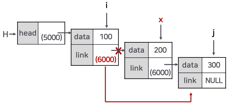삭제할 노드의 이전 노드 포인터를 → 삭제할 노드의 다음 노드를 가리키도록 변경