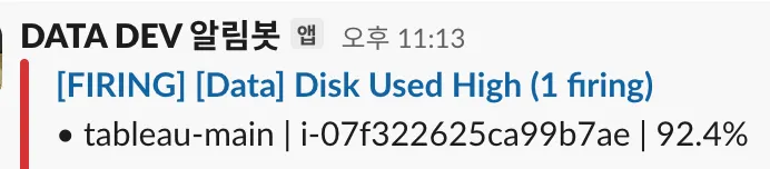 태블로 백업 작업중 디스크 알람 예시