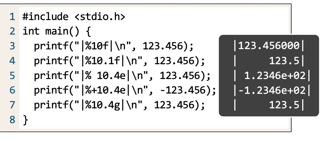 실수 | %f, %e, %E, %g, %G | 실수형(고정/지수/간결형) 출력 |