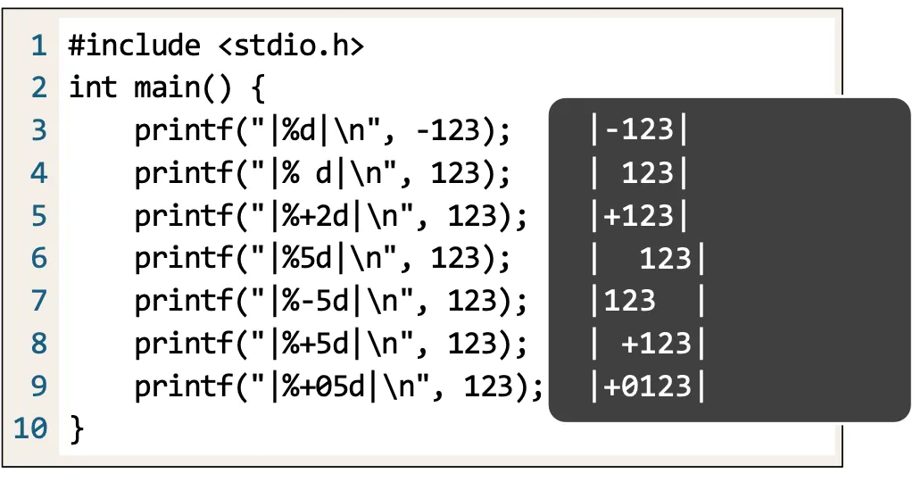 정수 | %d, %u, %o, %x, %X | 10진, 부호 없는 10진, 8진, 16진 출력 |