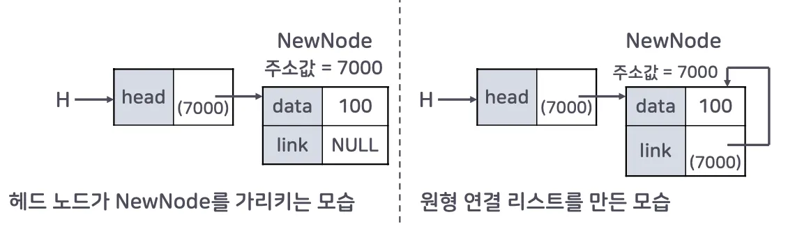 NewNode->link = NewNode; // 자기 자신을 가리켜 원형 완성