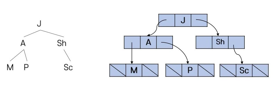 각 노드가 자기 자신을 구조체(struct)로 가지며 왼쪽 자식과 오른쪽 자식을 포인터로 연결하는 방식