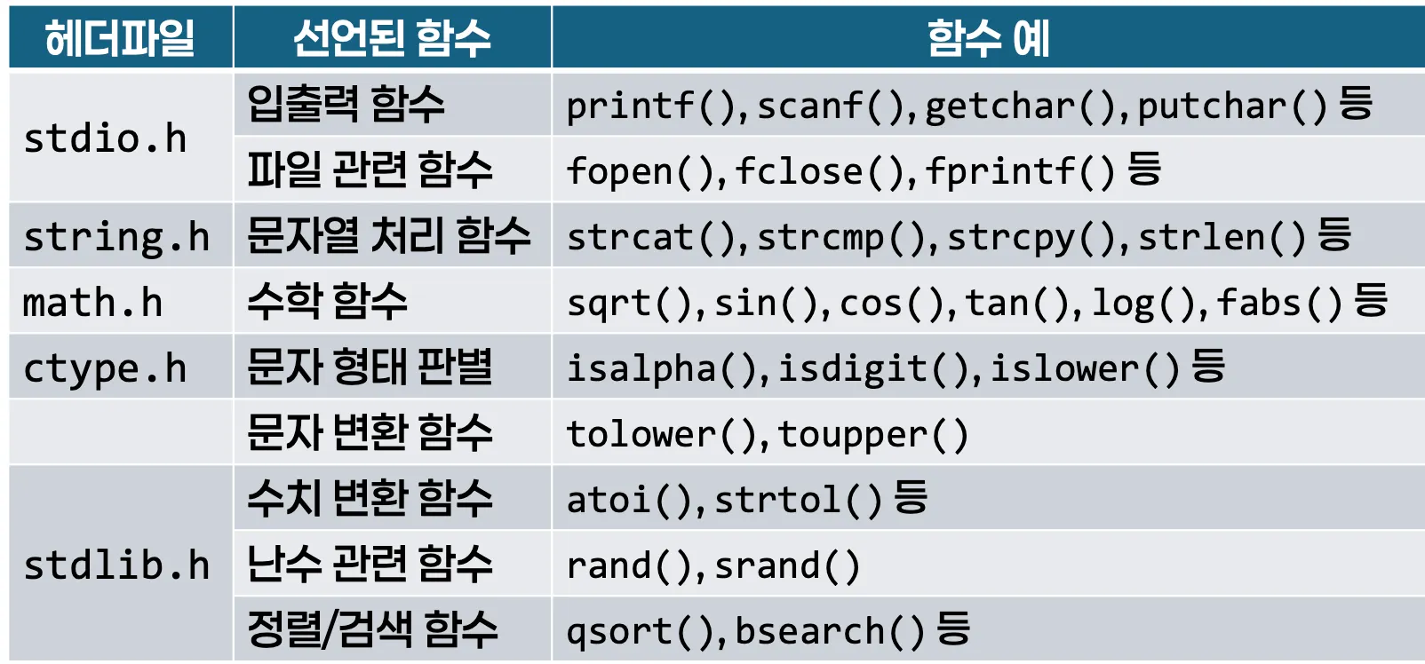 필요한 표준함수의 원형이 선언되어 있는 헤더파일을 미리 포함(#include)해야 함