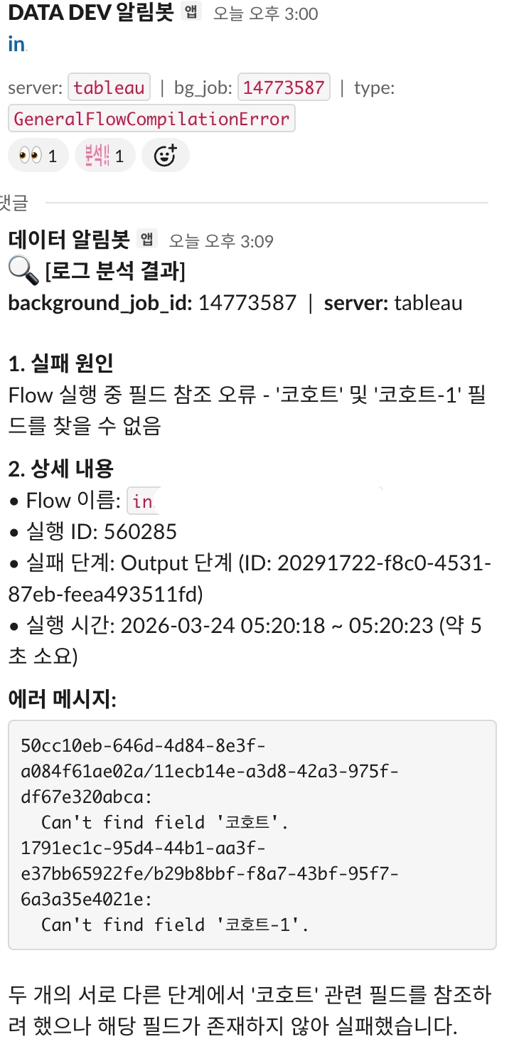 Flow나 Extract 실패 시 종종 BI에서 로그 분석 요청이 들어오는데, 로그를 수작업으로 추적하고 타임라인을 맞추는 과정에서 건당 평균 1~2시간이 소요되었다. 이 요청이 주 2~3회 반복되면서 운영 병목으로 이어졌다.