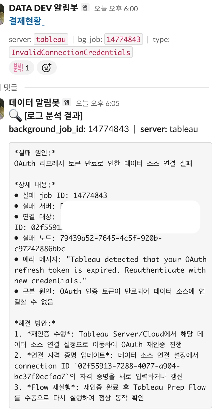 내가 SSH에 접속할 필요도, ziplog을 받을 필요도, LLM에 수동으로 던질 필요도 없다. 분석가가 직접 이모지를 달고 직접 결과를 받아볼 수 있게 됐다.